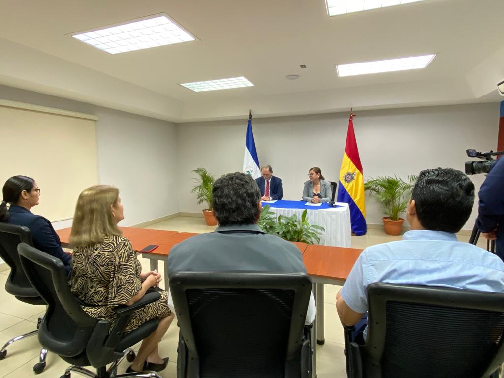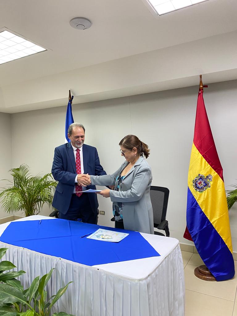 El equipo de Rectorado de la UNAN-Managua, dirigido por la Dra. Ramona Rodríguez Pérez, sostuvo esta mañana un encuentro con el Dr. Elmo Bell Smythe, rector de la Universidad Latinoamericana y del Caribe (ULAC), de Venezuela, con el fin de conversar sobre el establecimiento de acciones de colaboración en el tema de formación en posgrado. Como parte de su visita, el doctor Bell conoció el funcionamiento de la DEVD, además, interactúo con autoridades de la Facultad de Humanidades y Ciencias Jurídicas.